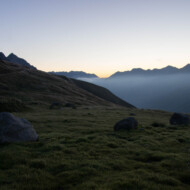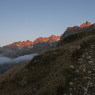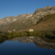 An den Grashalmen hängen noch dicke Tautropfen und stellenweise ist Raureif zu sehen. Andermatt steckt noch in den restlichen Wolken, aber der Galenstock leuchtete schon rosarot in der Morgensonne. Gestern noch betrug die Sicht keine 20 Meter und jetzt, kann ich vom Oberalppass bis zum Furkapass blicken! Was gibt es schöneres als so in den Tag zu starten?